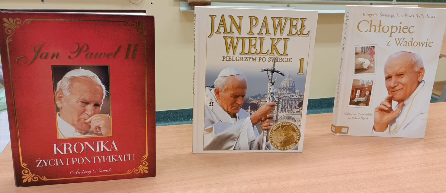oraz konkursie wiedzy o życiu i działalności św. Jana Pawła II, który obejmował pytania otwarte i krzyżówkę.